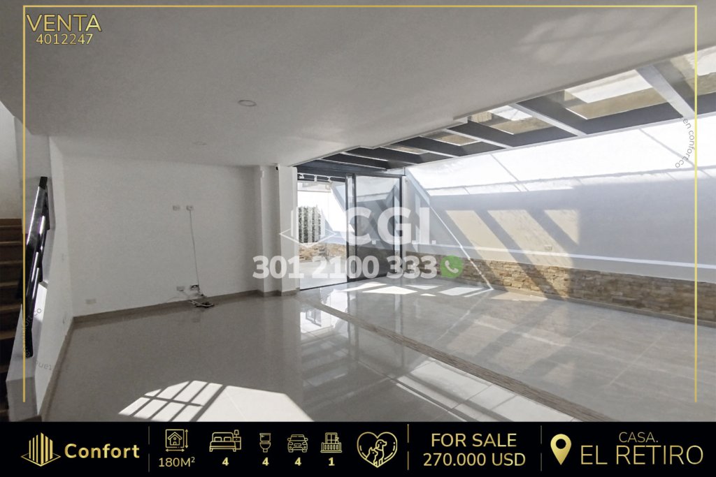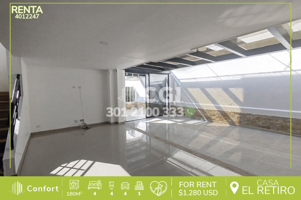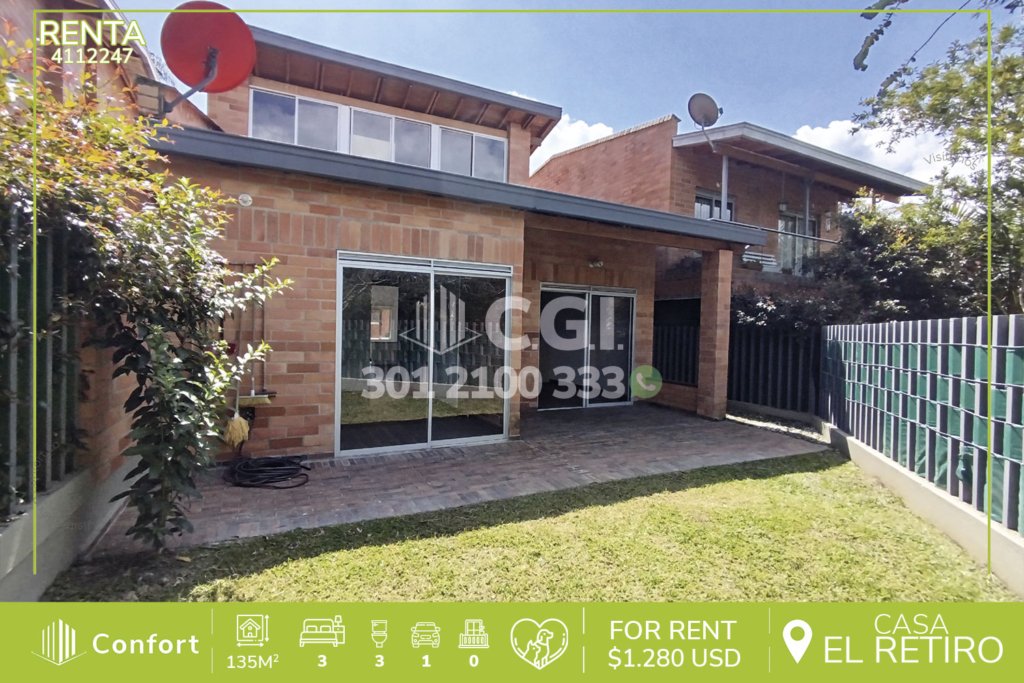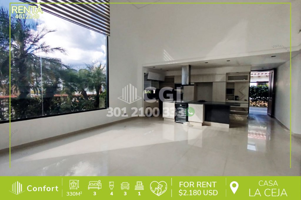 46-12-249 Casa disponible para la renta en La Ceja, Antioquia., cuenta con un área total de 408 mts2, de los cuales 330 mts2 están construidos y distribuidos en sala comedor amplia, cocina integral, zona de ropas, 3 habitaciones con su respectivo vestier y baño privado, área que se puede utilizar como estudio o gym, baño social, balcón con buena vista, cuarto útil, 2 parqueaderos descubiertos y uno...