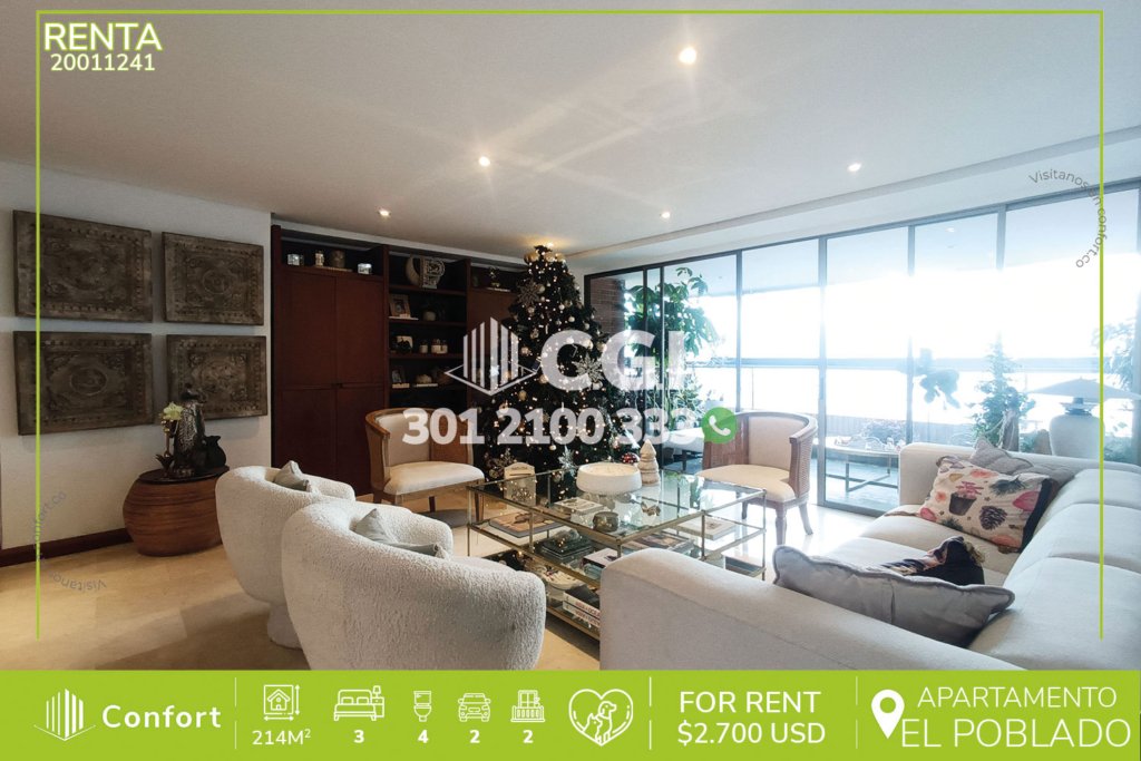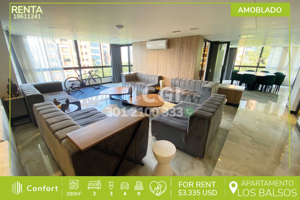 200-11-241 Inmobiliaria en Medellín arrienda apartamento ubicado en exclusivo sector de El Tesoro en El Poblado, cuenta con un área de 214mt2 distribuidos en sala comedor independientes, cocina integral, zona de ropas, 3 habitaciones de excelente tamaño cada una con su respectivo vestier y baño privado, adicional podemos encontrar sala de estar, baño social y 2 balcones, uno de ellos tipo terraza,...