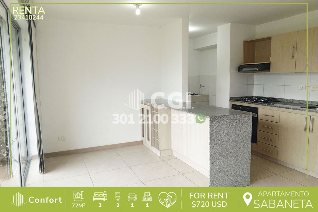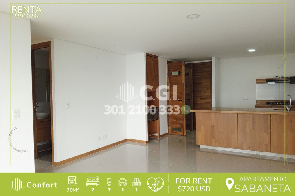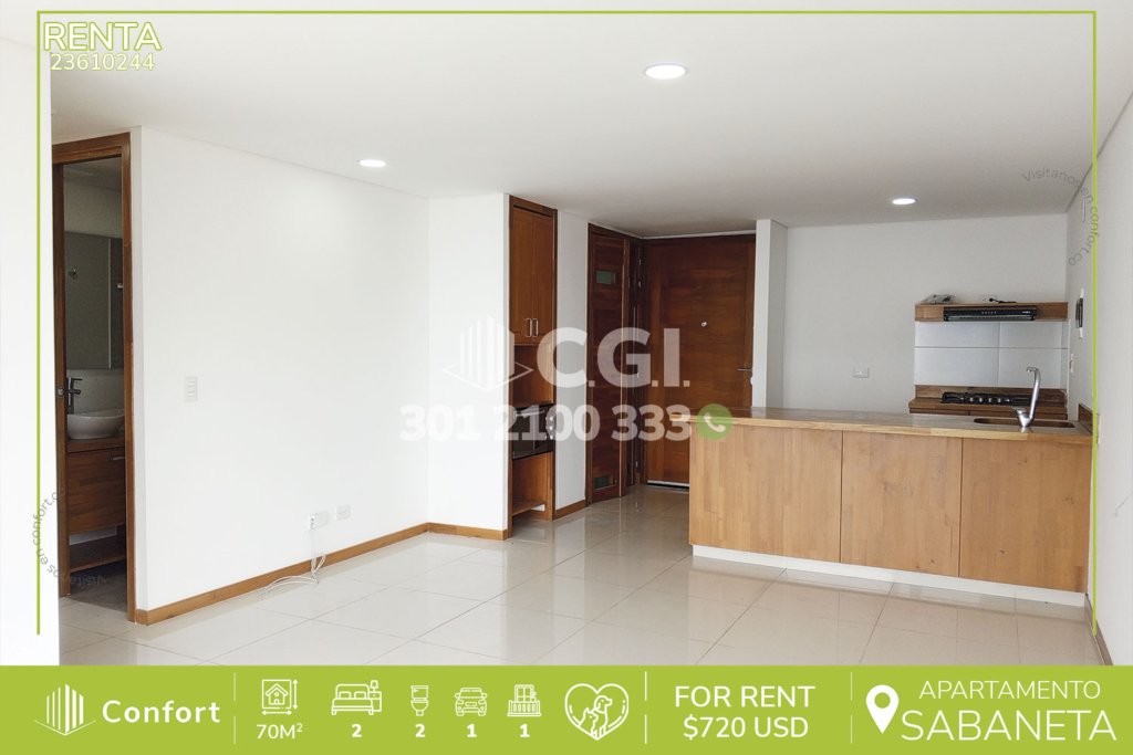 239-10-244 Inmobiliaria en Medellín arrienda apartamento ubicado en tranquilo sector de Sabaneta, cuenta con 70mt2 distribuidos en sala comedor de muy buen espacio, cocina integral con barra americana, zona de ropas, balcón, 2 habitaciones, una de ellas con baño privado, vestier y la otra con clóset, baño social, parqueadero y cuarto útil. Ubicado en unidad con seguridad 24/7 y con zonas comunes en...