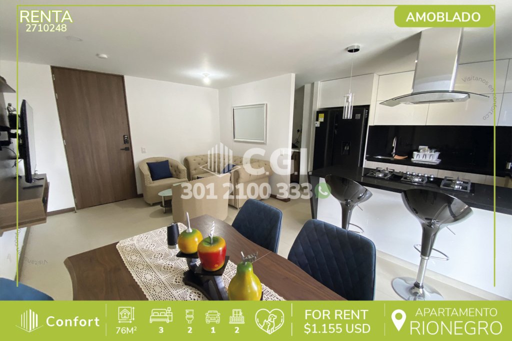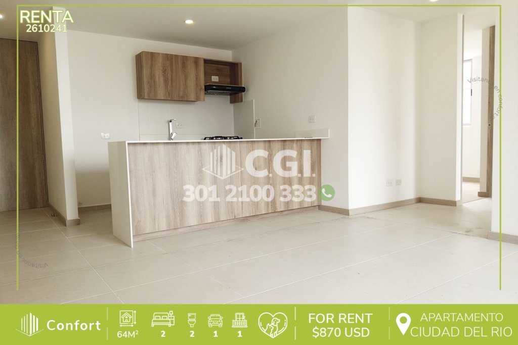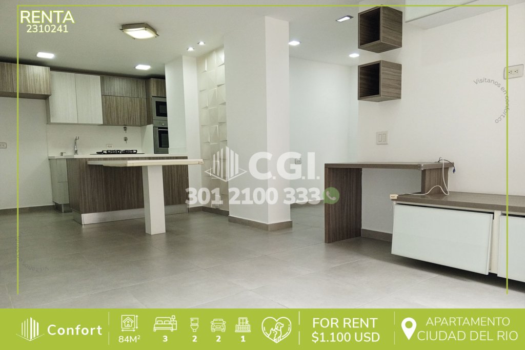 29-10-241 Inmobiliaria en Medellín arrienda apartamento ubicado en tranquilo sector de Cuidad del Río en El Poblado, cuenta con 80mt2 distribuidos en sala comedor de muy buen espacio, cocina semi integral con barra americana, zona de ropas, balcón, 2 habitaciones con su respectivo baño privado, baño social, parqueadero y cuarto útil. Ubicado en unidad con seguridad 24/7 y con zonas comunes como...