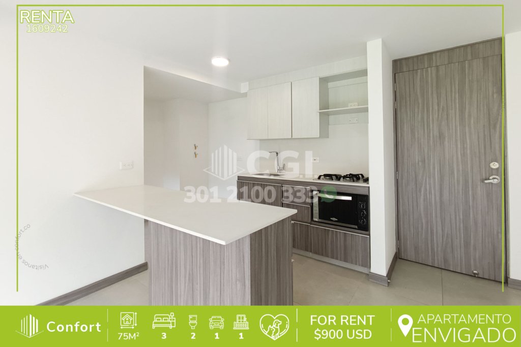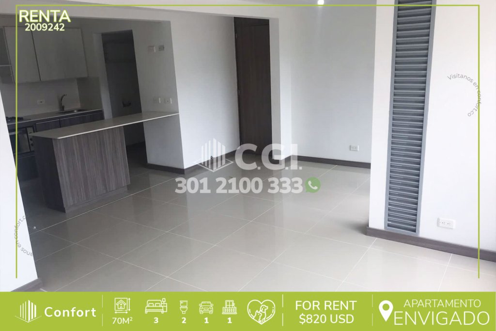 20-09-242 Inmobiliaria en Medellín arrienda apartamento en excelente sector de Las Brujas en Envigado, cuenta con un área de 70mt2 distribuidos en sala comedor, cocina semi integral moderna, zona de ropas, 3 habitaciones de excelente tamaño, de las cuales la habitación principal cuenta con clóset y baño privado, adicional podemos encontrar un baño social, amplio balcón con agradable vista,...