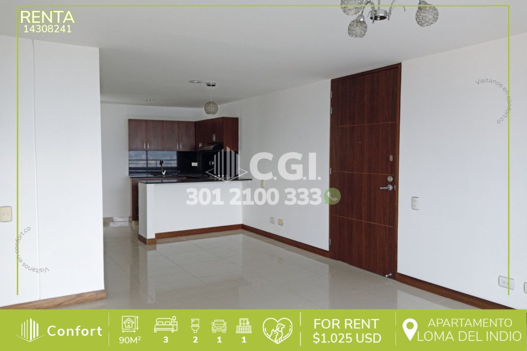 143-08-241 Inmobiliaria en Medellín arrienda hermoso apartamento ubicado por el sector de La Loma del Indio, cuenta con 90 mt² distribuidos en sala comedor, cocina integral abierta, balcón, zona de lavado, baño social, 3 habitaciones, cada una con su respectivo clóset, la principal con baño privado y vestier, parqueadero doble lineal y cuarto útil.- Ubicado en urbanización con seguridad privada...