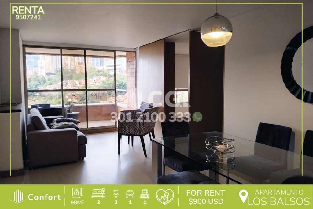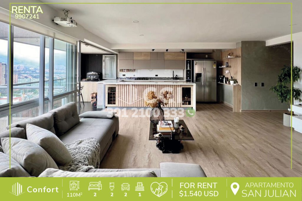 99-07-241 Inmobiliaria en Medellín arrienda excelente apartamento en el Poblado, barrio San Julián, cuenta con 110mts2 distribuidos en sala comedor, balcón, cocina integral, zona de ropa, baño social, habitación auxiliar con clóset, habitación principal con vestier y baño privado, 2 parqueaderos en línea y cuarto útil, ubicado en unidad con seguridad privada 24/7 y zonas comunes como Gimnasio,...