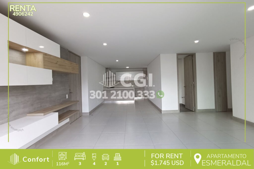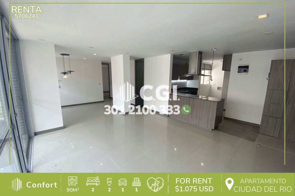 57-06-241 Hermoso y moderno apartamento disponible para la renta en tranquilo sector de Ciudad del Río en El Poblado, cuenta con 90mt2 distribuidos en 2 habitaciones, baño privado, vestier, baño social, sala comedor, cocina integral, balcón, zona de ropas y parqueadero, ubicado en unidad con seguridad 24/7 y zonas comunes tales como 2 piscinas una de ellas cubiertas, gimnasio, salón de niños, salón...