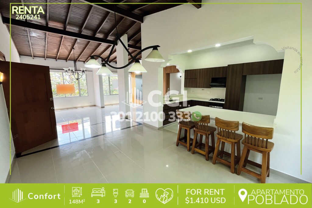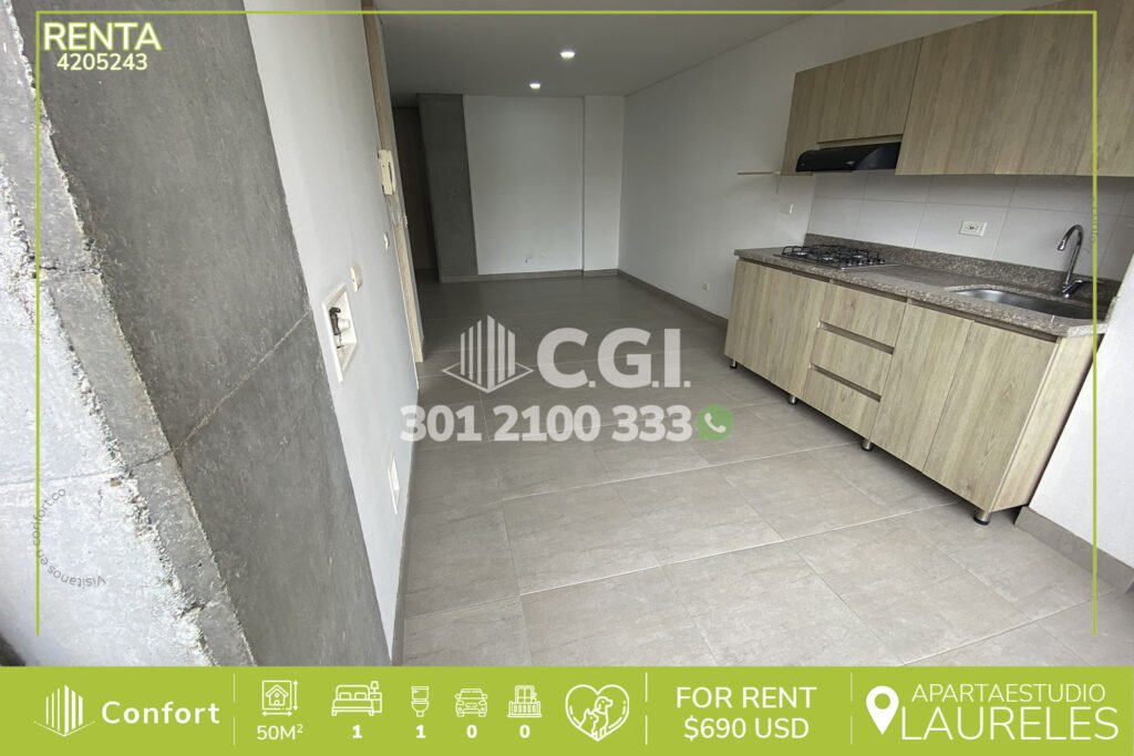42-05-243 Hermoso y moderno apartaestudio disponible para la renta ubicado en el sector de barrio laureles. Cuenta con un área de 50mt2 distribuidos en cocina semi integral con full iluminación y los más hermosos acabados, zona de ropas, baño, habitacion, sala comedor, ducha a gas, 2 clóset. Se encuentra en tranquilo sector. A su alrededor podemos encontrar bomba de los almendros, iglesia santa gema....