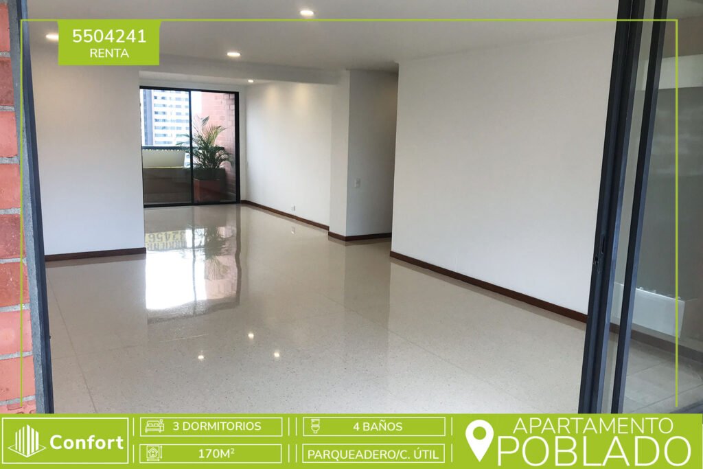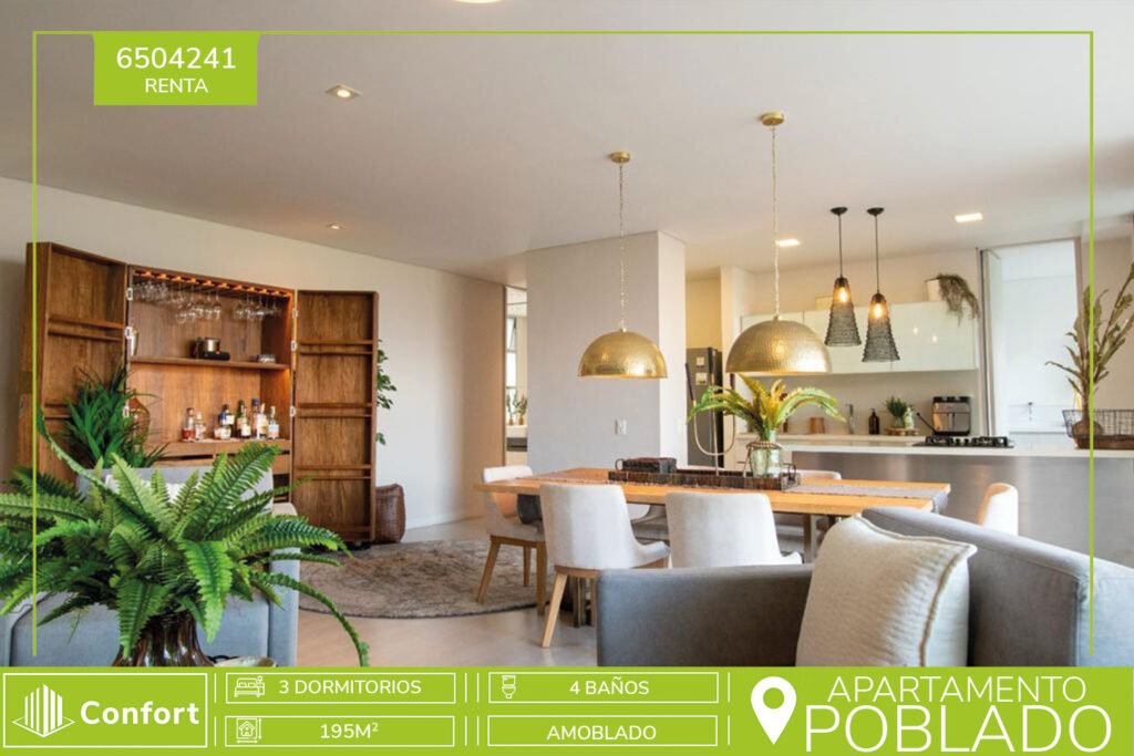 65-04-241 Espectacular apartamento amoblado de 195mts² ubicado en el Poblado, sector El Castillo, este portentoso inmueble cuenta con sala, comedor, sala de estar, estudio, 3 habitaciones con baño privado, baño social, balcón, hermosa cocina integral abierta, habitación de servicio con baño, zona de ropas, 2 parqueaderos y 2 cuartos útil. La exclusiva unidad residencial cuenta con piscina para...