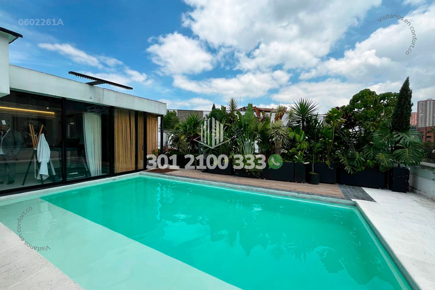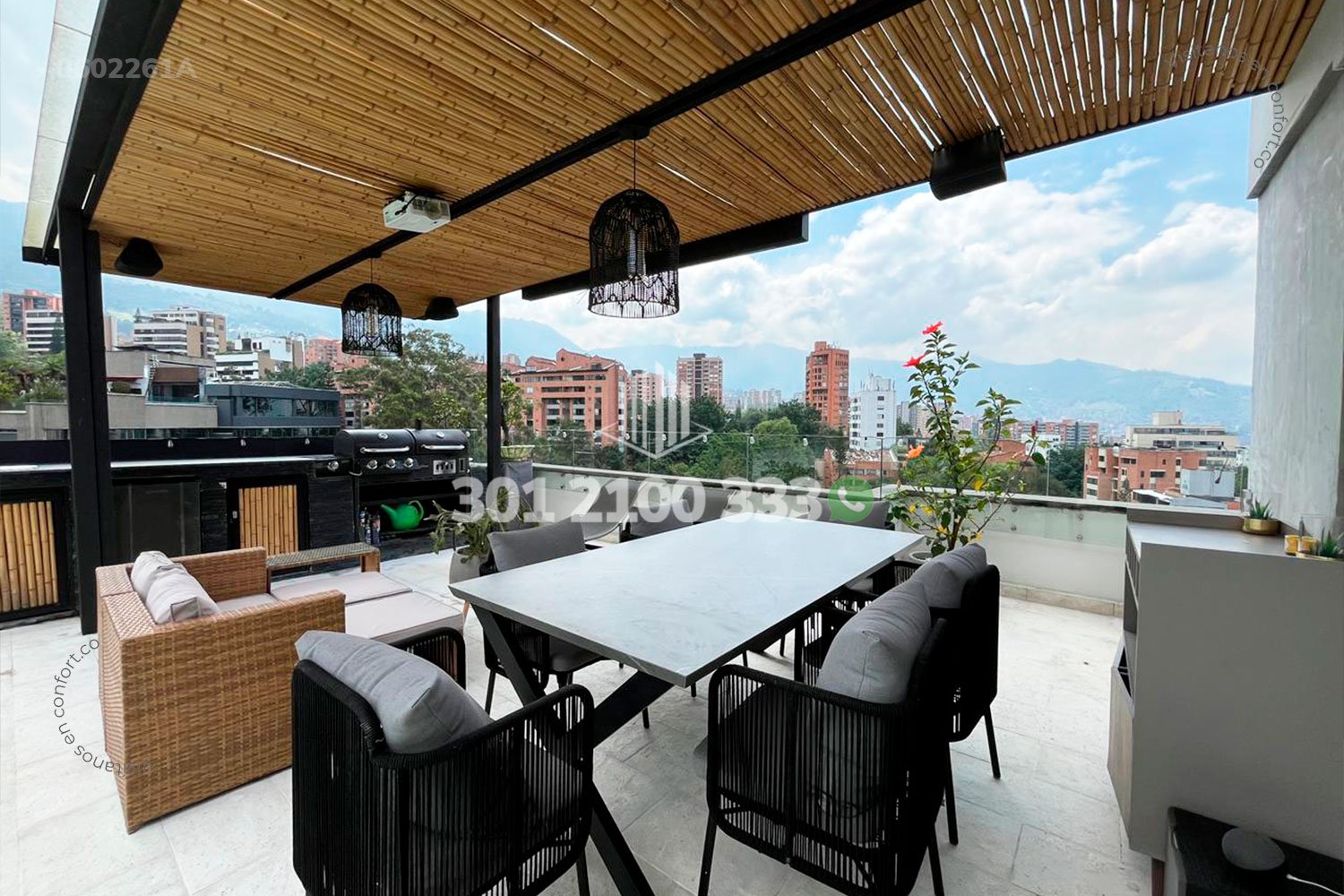 06-02-261A Inmobiliaria en Medellín arrienda moderno penthouse amoblado en el sector de San Lucas en el Poblado. Cueta con un área de 420mt2 distribuidos en sala comedor, cocina semi integral con barra, zona de ropas, sala de estudio, baño social, 3 habitaciones, cada una con baño y la principal de ellas con bañera y vestier, además el penthouse cuenta con terraza con zona BBQ y piscina privada, 2 parqueaderos privados y cuarto útil. Ubicado en unidad residencial con seguridad 24/7 y zonas comunes como piscina para adultos, turco y parque infantil. A sus alrededores podemos encontrar Pricesmart, Carulla Fresh, mall la Frontera. Con vías de acceso por Transversal Intermedia y gran variedad de rutas de trasporte público. CONFORT GESTORES INMOBILIARIOS – Arriendo en el Poblado