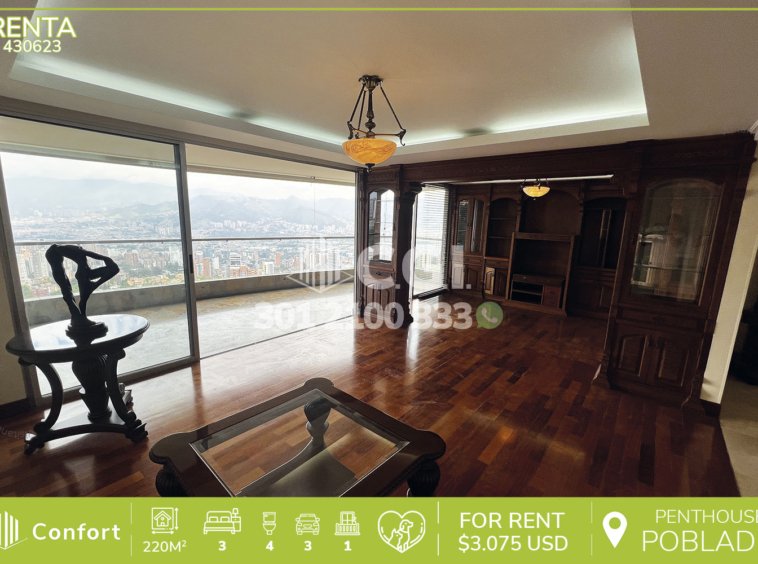 43-06-23 Inmobiliaria en Medellín arrienda penthouse ubicado en exclusivo sector de El Poblado, cuenta con un área de 220mts2 distribuidos en sala comedor amplia, cocina integral, balcón, zona de ropas, área de estudio, 3 habitaciones con su respectivo baño privado, baño social, biblioteca, 3 parqueaderos privados y cuarto útil. Ubicado en unidad con seguridad 24/7, salón social, zona infantil y zonas verdes, a su alrededor podemos encontrar la Universidad CES, Hotel Binn y el hotel Intercontinental, con acceso por la Transversal Superior y gran variedad de rutas de transporte púbico. CONFORT GESTORES INMOBILIARIOS – Arriendo en El Poblado